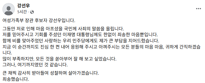 강선우 후보자의 입장문: “여기까지였던 것 같습니다”