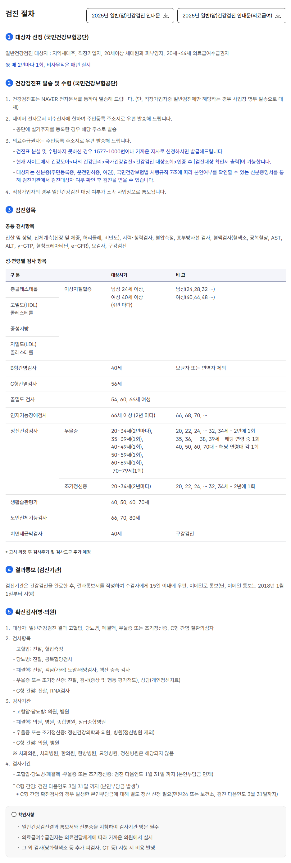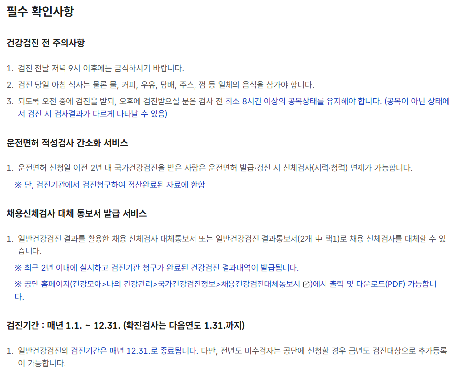 - 혈액 검사: 공복 필수! 탈수 방지를 위해 검진 전날 물을 충분히 마시는 게 좋습니다.