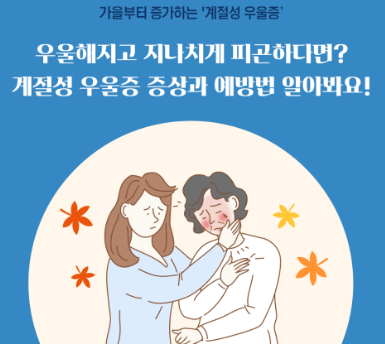 “나 가을타나봐!” 가을이 되면 하나둘 떨어지는 낙엽을 보며 사색에 잠기는 사람들을 자주 볼 수 있어요. 계절이 바뀌어서 기분이 왠지 가라앉는다고 가볍게 넘길 수 있지만, 시간이 지나도 기운이 빠지고 잠이 몰려온다면 '계절성 우울증'을 의심해 볼 수 있답니다. 오늘은 복건강에서 가을과 겨울에 늘어나는 계절성 우울증의 증상과 예방법에 대해 자세히 알아보려고 해요.