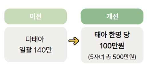 - 미숙아·선천성 이상아 의료비 지원: 소득 기준을 폐지하고, 미숙아 및 선천성 이상아의 의료비 지원 기간을 확대하여 가정의 부담을 줄입니다.