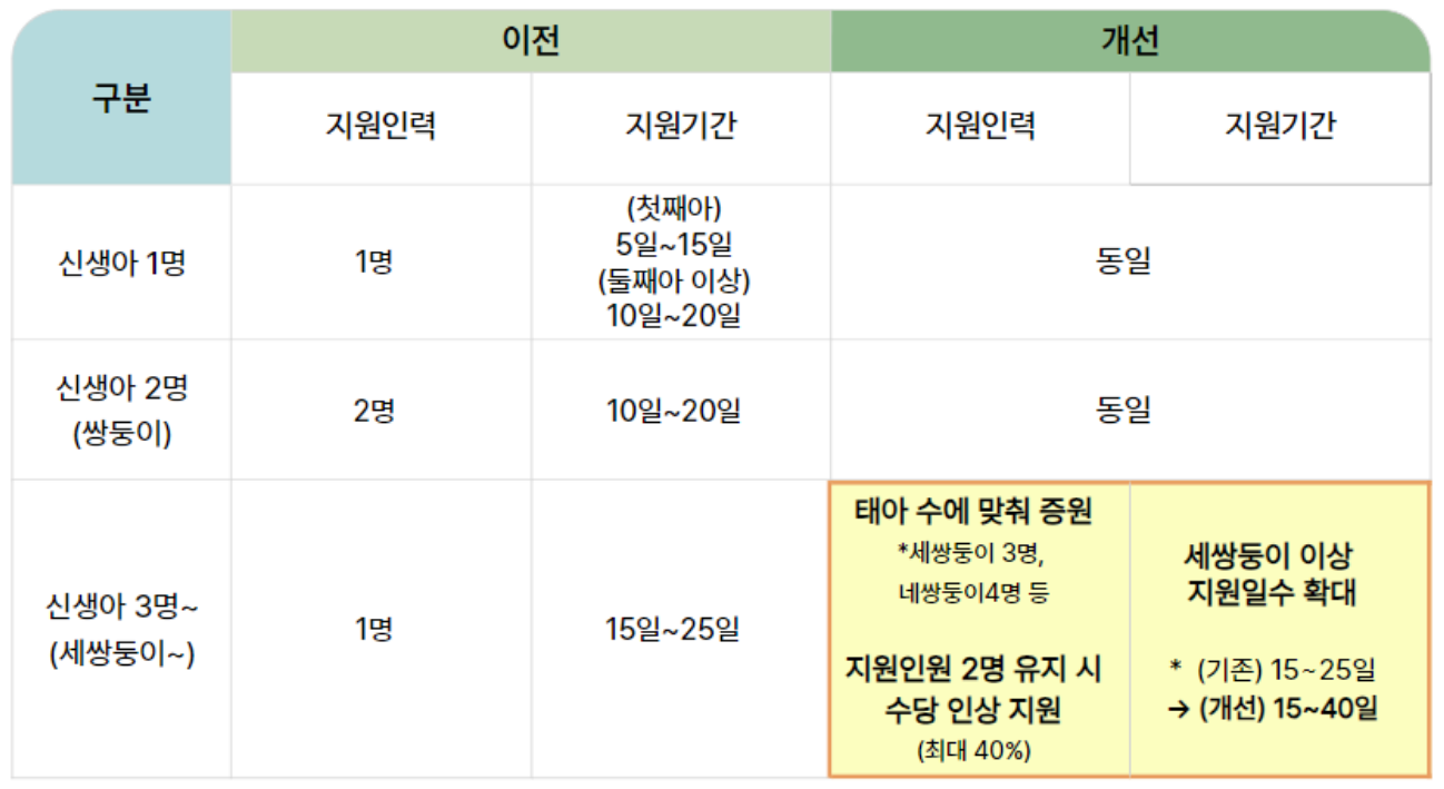 - 배우자 출산휴가 확대: 다둥이 출산 가정의 배우자에게는 출산휴가가 20일로 확대됩니다.
