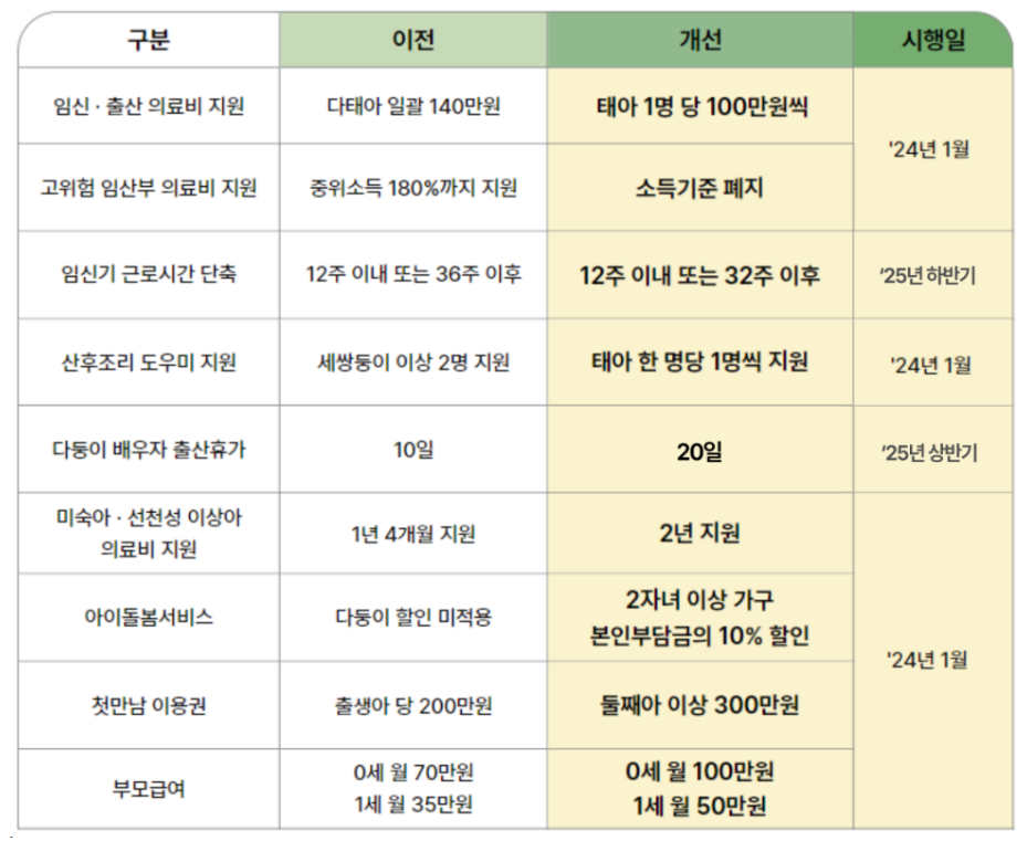 - 산모·신생아 건강관리 지원 확대: 다둥이 가정을 위해 건강관리 지원 인원과 기간을 확대하여 맞춤형 서비스를 제공합니다.