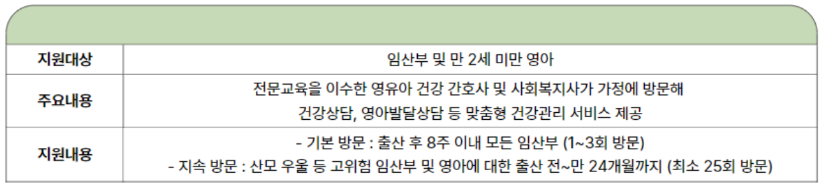 - 생애초기 건강관리 사업 확대: 보건소에서 간호사 등의 전문 인력이 가정을 방문하여 건강 상담과 영아 발달 상담 등 맞춤형 건강관리 서비스를 제공합니다.