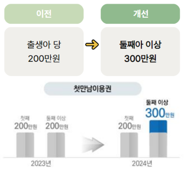 - 첫만남이용권 확대: 둘째 아이 이상 자녀에게는 출생 초기 양육 부담을 경감하기 위해 자녀당 300만 원을 지원합니다.