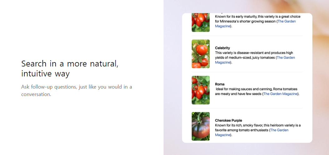 - 출처 명확성: 서치GPT는 답변에 대한 출처를 명확히 밝히며, 원본 출판물과 사용자 간의 연결을 강화합니다. 이는 정보의 신뢰성을 높이고, 원본 게시자에게 더 많은 선택권을 제공하기 위한 기능으로 설계되었습니다.