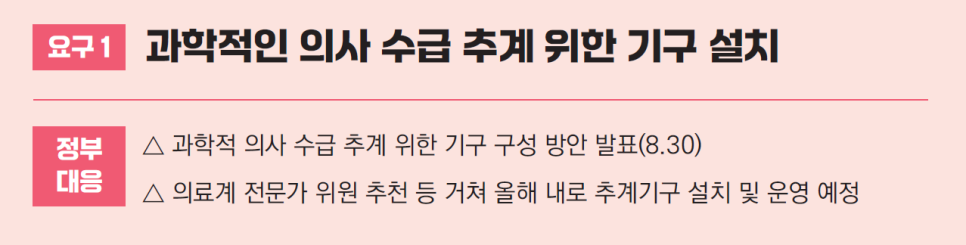 전공의들이 가장 먼저 요구한 사항은 의사 수급을 과학적으로 추계할 수 있는 기구의 설립입니다. 현재 한국의 의사 수는 일정 부분 부족하다는 의견이 존재하지만, 지역별, 분야별로 격차가 큽니다. 이에 따라 단순한 증원이 아니라, 정확한 데이터를 바탕으로 한 수급 추계가 필요합니다. 정부는 의료개혁특별위원회를 통해 전문가와 소비자 단체가 참여하는 기구 설립을 준비 중이며, 이를 통해 의대 정원 문제를 해결할 계획입니다.
