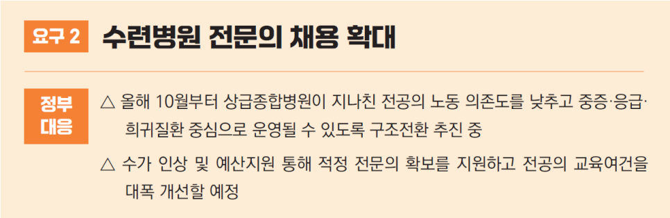 현재 상급종합병원은 전공의의 과도한 노동력에 의존해 운영되는 경우가 많습니다. 이로 인해 전공의들의 업무 강도는 매우 높고, 환자에게 제공되는 의료 서비스의 질도 저하될 우려가 있습니다. 정부는 상급종합병원의 구조를 개혁하여 전문의 중심으로 운영될 수 있도록 지원하며, 병원의 본래 기능인 중증질환 진료, 연구, 교육에 집중할 수 있는 환경을 조성하고자 합니다. 이를 통해 전공의들의 근로 환경을 개선하고, 전문인력을 보다 안정적으로 확보할 수 있도록 할 계획입니다.