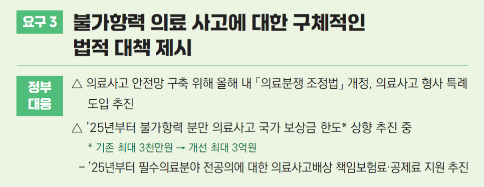 불가항력적인 의료 사고에 대한 보상 체계도 개선되고 있습니다. 특히 분만 중 발생하는 불가항력 사고에 대해 기존 최대 3천만 원의 보상 한도를 3억 원으로 상향하는 등의 현실적인 대책이 마련되고 있으며, 필수의료 분야 전공의들에게는 의료사고 배상 책임 보험료를 지원할 계획입니다. 이를 통해 보다 안정적인 진료 환경을 제공함과 동시에 의료인의 심리적 부담을 경감시키고자 합니다.