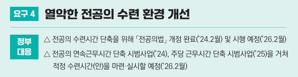 전공의들은 매주 80시간 이상의 근무를 소화해야 하는 열악한 환경에 처해 있습니다. 이러한 상황을 개선하기 위해 정부는 전공의 근무 시간을 단축하는 방안을 추진 중이며, 이를 위한 시범사업도 진행 중입니다. 특히 전공의들이 안정적으로 수련을 받을 수 있도록 수련환경 개선과 함께 처우 개선도 동시에 이루어질 예정입니다.