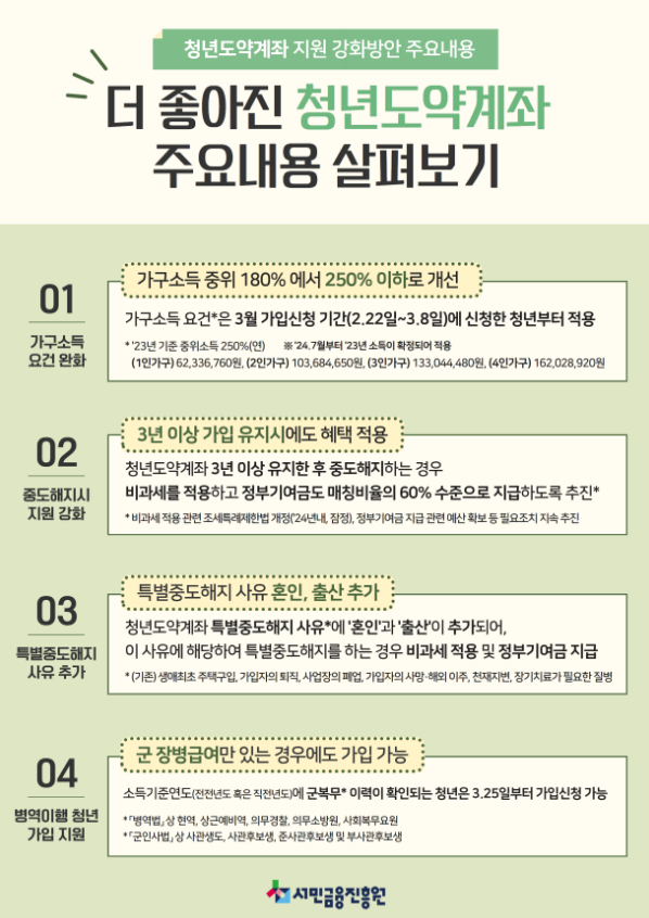 이번 청년도약계좌는 기여금 지원 확대와 매칭한도 상향 등 여러 혜택이 개선되었어요.