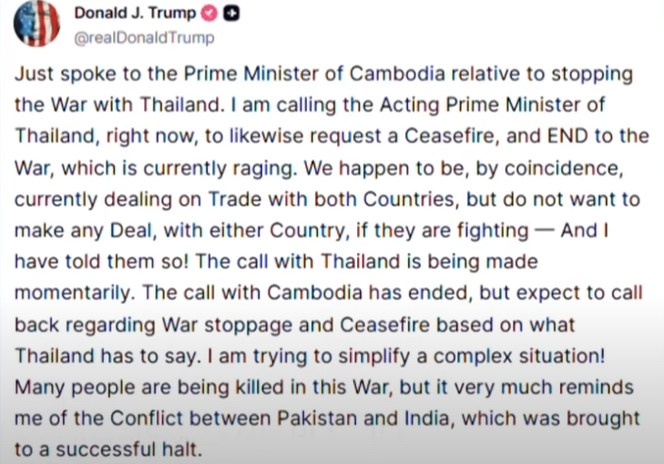 이와 함께 트럼프는 미국과 태국·캄보디아 간 예정되어 있던 무역 협상 유보 및 관세 압박을 시사하며 외교+경제적 압박을 동원한 중재 전략을 펼쳤습니다.