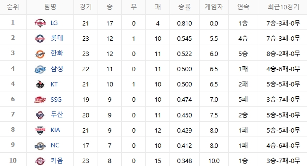 반면, NC 다이노스는 선발 로건 앨런이 2이닝 4실점으로 부진하며 조기 강판당했습니다. 로건은 이번 시즌 처음으로 짧은 이닝만에 내려오며 시즌 3패를 기록했는데요. NC 타선에서는 손아섭(4타수 4안타 3타점)이 분전했지만, 팀의 대패를 막기에는 역부족이었습니다.