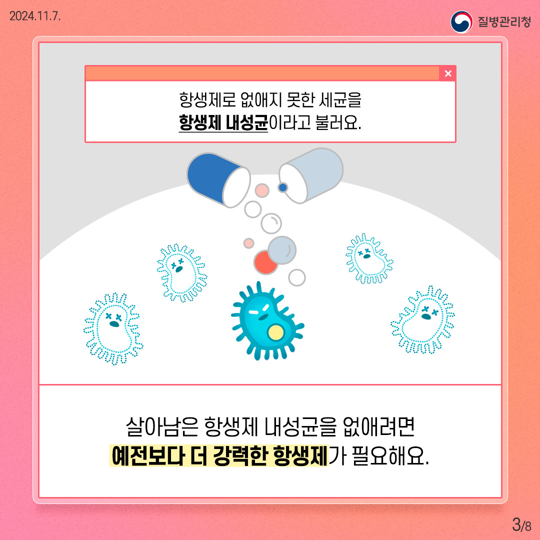 하지만 항생제를 과도하게 사용하거나 잘못 사용하면 세균이 항생제에 내성을 갖게 돼요. 이렇게 내성을 가진 세균이 점점 증가하면, 우리가 사용할 수 있는 치료 옵션이 줄어들게 되죠.