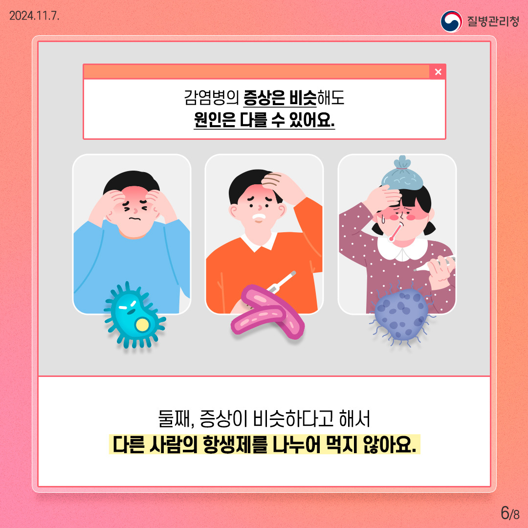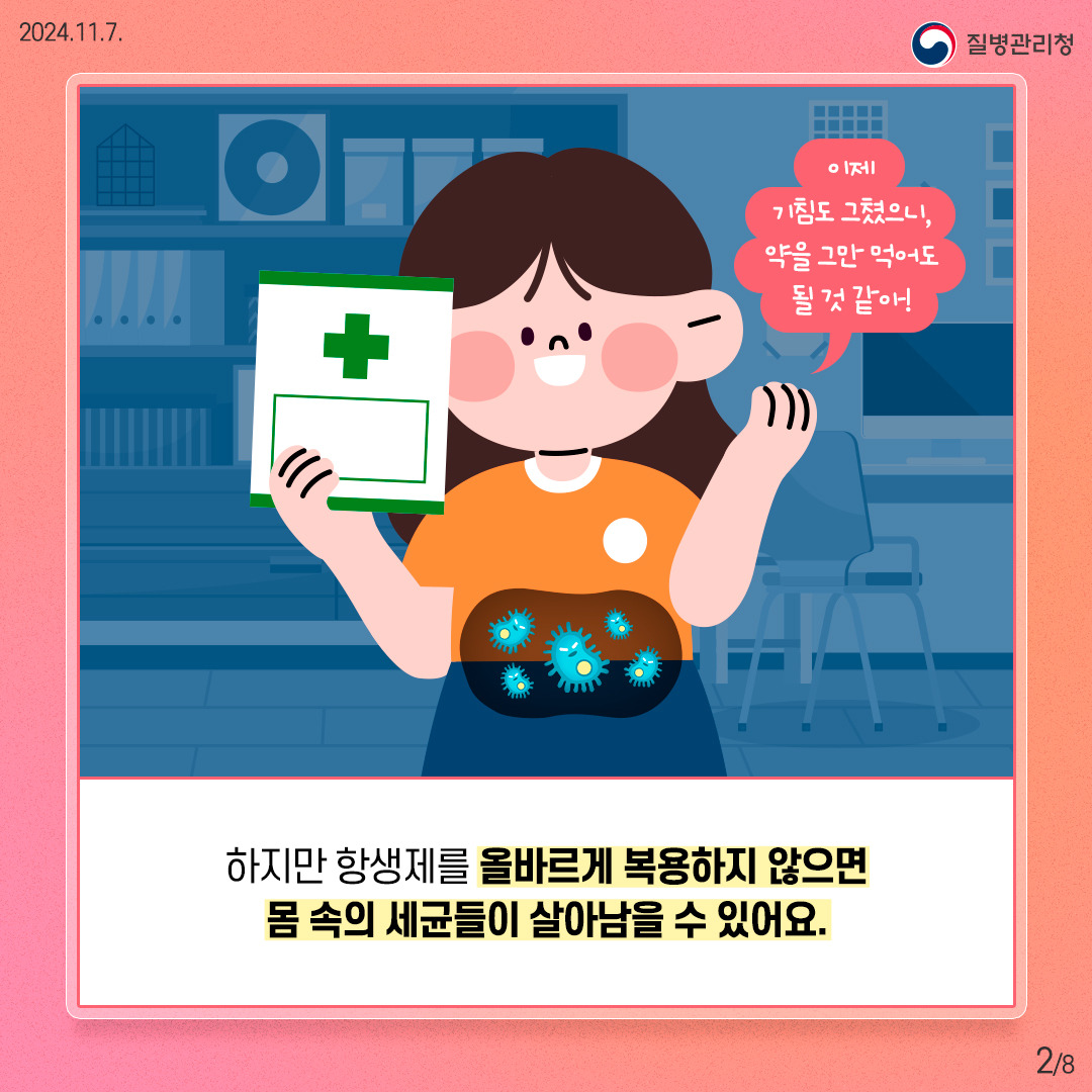 - 의사의 처방 없이 항생제를 복용하지 말고, 처방받은 약은 끝까지 복용하세요.