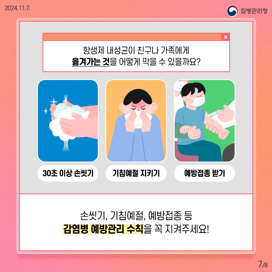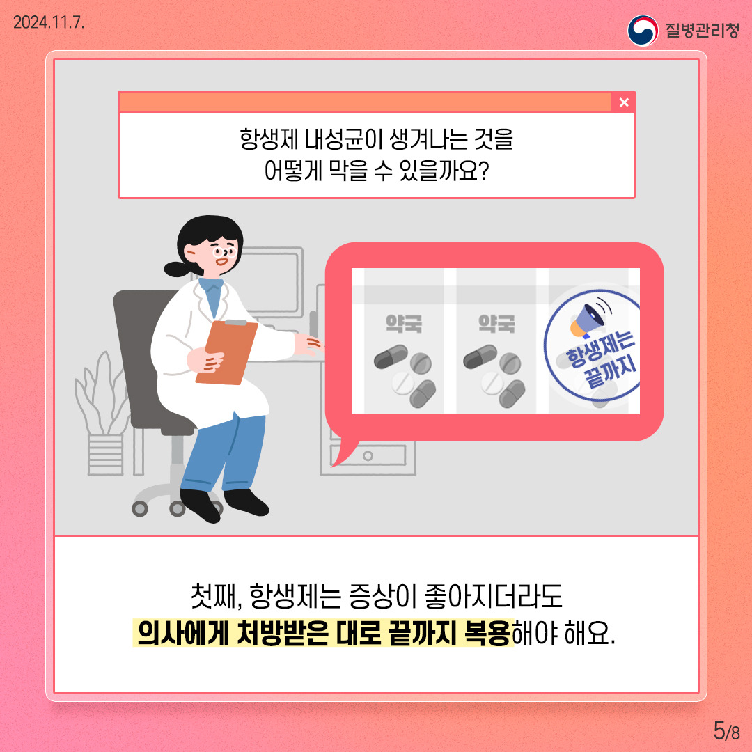 - 주변 사람들에게 항생제 내성의 위험성을 알려 의식을 높이는 데 기여하세요.