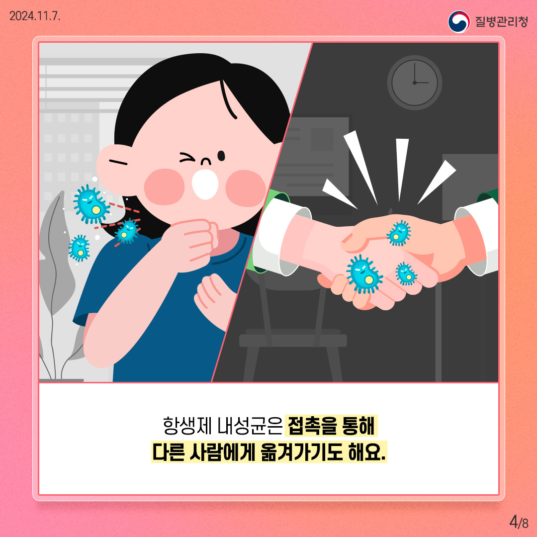 - 병원은 항생제가 많이 사용되는 곳이기 때문에 내성균이 번식하기 쉬운 환경이에요.