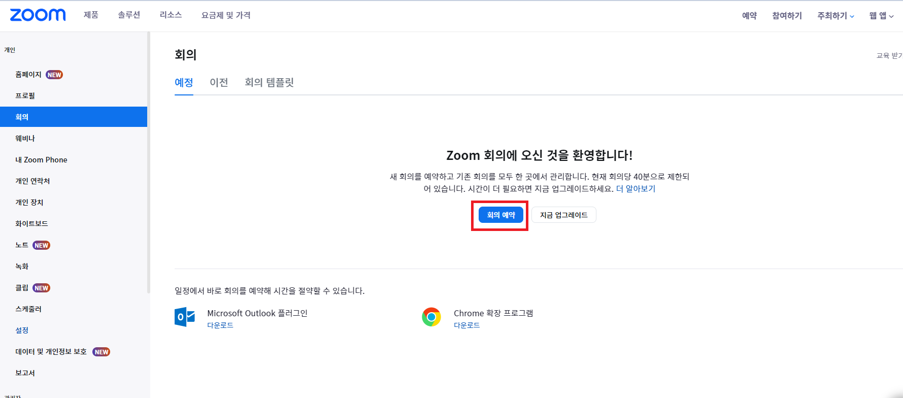 접속하면 아래와 같은 화면이 나타나는데 이중에 가운데에 있는 회의 예약을 누르면 회의를 만들 수가 있습니다.