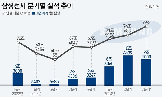 이번 3분기 삼성전자의 매출 79조 원은 분기 기준 역대 최대치를 기록한 것입니다. 이전 최고 기록은 2022년 1분기의 77조 7800억 원이었습니다.