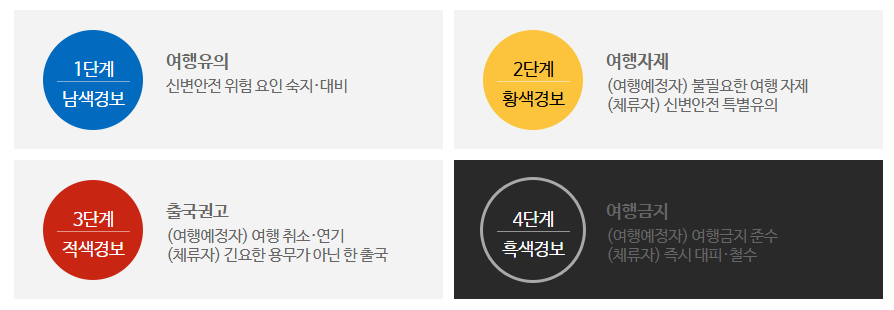 - 4단계 (흑색경보): 여행 금지 – 모든 여행 금지, 체류자는 즉시 대피 또는 철수 권고